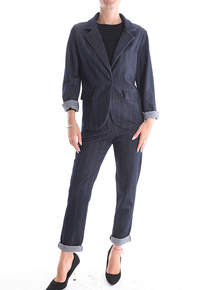 Dieses elegante zweiteilige Damen-Büroanzugsset überzeugt mit einem stilvollen Streifenmuster und einem klassischen Kragen. Der Gürtel akzentuiert die Taille perfekt, während praktische Taschen für Komfort und Funktionalität sorgen. Hergestellt aus hochwertiger Viskose, Polyester und Elasthan bietet der Anzug angenehmen Tragekomfort und eine optimale Passform. Made in Italy – für anspruchsvolle Frauen, die im Büro sowohl Professionalität als auch Stil zeigen möchten.